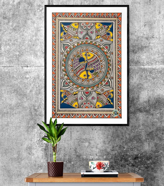 Madhubani - also referred to as Mithila Art (as it flourishes in the Mithila region of Bihar), is characterized by line drawings filled in by bright colours and contrasts or patterns. These paintings are popular because of their tribal motifs and use of bright earthy colours. These paintings are done with mineral pigments prepared by the artists. The work is done on freshly plastered or a mud wall. For commercial purposes, the work is now being done on paper, cloth, canvas etc. Here we present the art prints of these creative marvels.